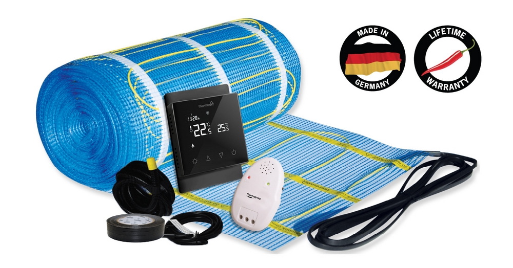 Includes - Heating Mat, Programmable Thermostat (available in Black or White), Heating Cable Monitor & Roll of Cloth Tape