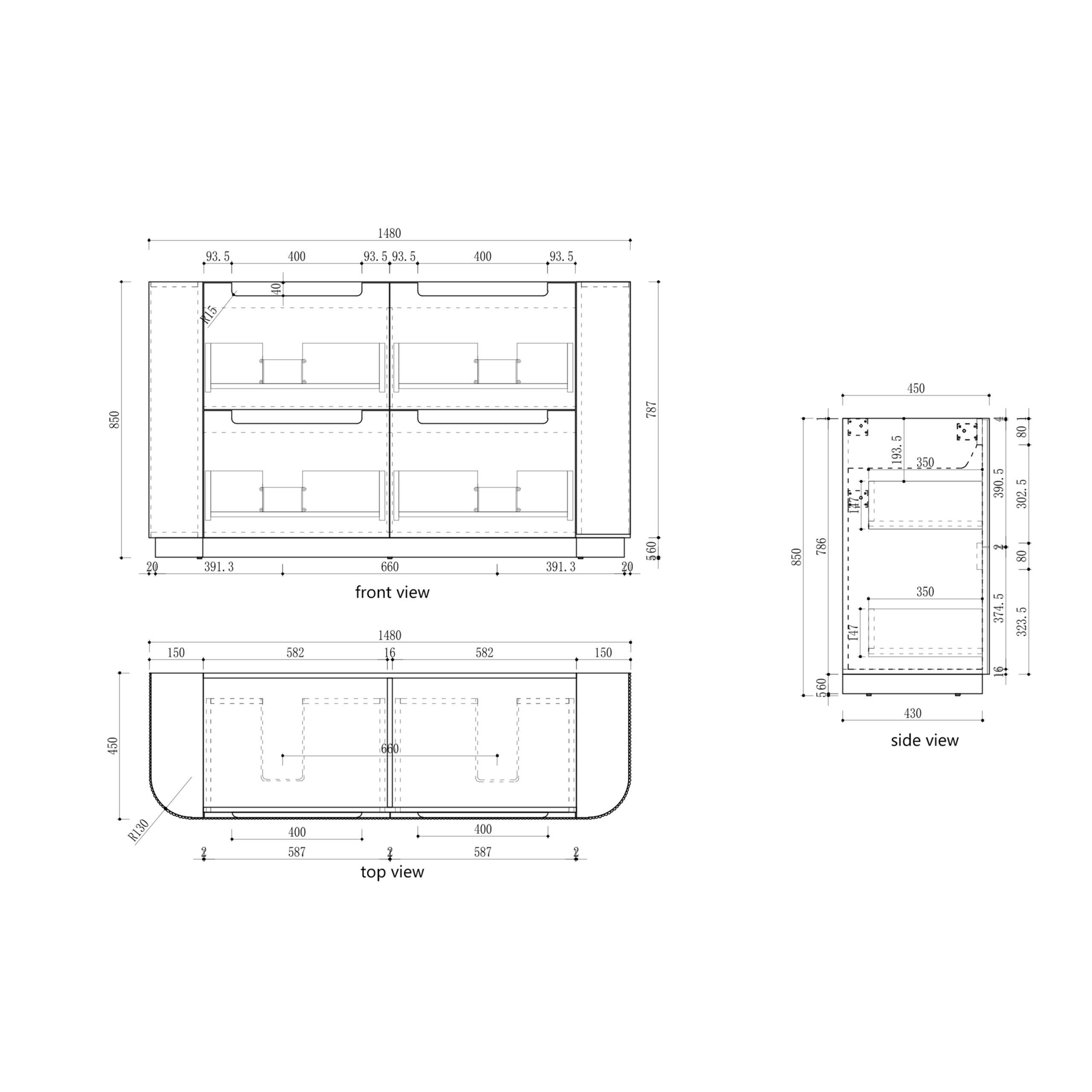 All-drawers model with curved feature ends Premium grade, durable timber plywood Stacked drawers: Versatile and spacious Contemporary V-groove polyurethane matte white finish Hettich Quadro S full extension, soft close drawer runners Drawer organisers included Minimalist L-rail design finger pull drawers Premium graphite interior.